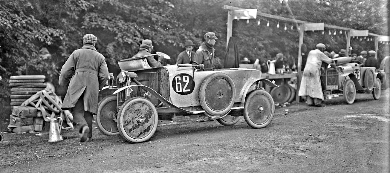 Les cyclecars suivent les trois roues alors qu'un commissaire de piste s'écarte à gauche, armé de son mégaphone qui aidait sans doute à appeler les concurrents. À droite, un Fournier 1100 cm3 mené par son constructeur. Légèrement en retrait, aux mains de Yoon, va s'élancer un 1100 G.N. (Godfrey & Nash) au moteur bicylindre en V culbuté monté transversalement et débordant du capot.