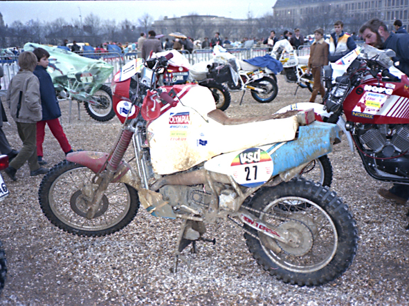 Peut-être un futur client pour les "Dakar" d'aujourd'hui ? La n° 27 était celle du motociste Patrick Vallet qui abandonnera à l'issue du prologue de Cergy-Pontoise, les moyens financiers espérés n'étant pas réunis. Même destin pour Pierre-Marie Poli (rédac'chef de Moto Journal) sur une machine identique (n° 130).