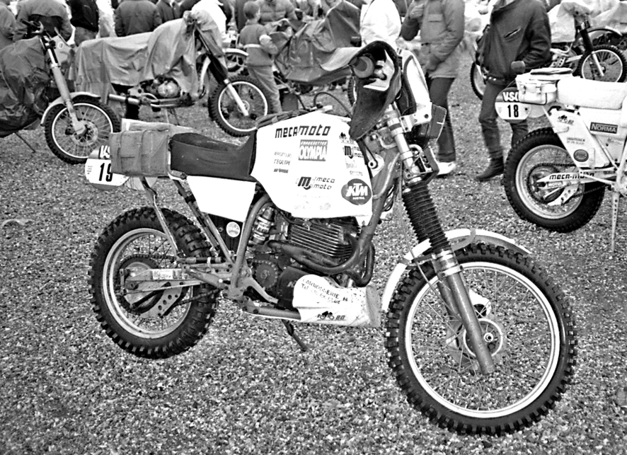 KTM est riche de nombreux titres mondiaux en moto-cross ou enduro (Heinz Kinigadner, Gennadji Moisseev, Alessandro Gritti...), acquis en 125 et 250 deux-temps (Sachs). Puis l'autrichienne est passée au quatre-temps avec ce Rotax mono ACT, autre produit autrichien qui aura du mal à convaincre. La 19 abandonnera tout comme toutes les autres KTM sauf une qui termine 21ème. Il est vrai qu'elle était menée par l'athlétique Herbert Schek, un spécialiste de l'enduro allemand où on le trouvait habituellement sur des flats BMW.