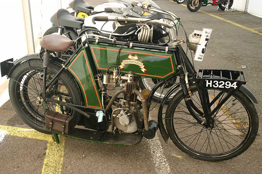 Le moteur De Dion de la Dreadnought est unique avec ses deux tubes d'échappement alors qu'il n'a qu'une seule soupape à cet usage, l'admission étant automatique. Une "amélioration" toute britannique à une construction bien française à l'origine. En des temps plus anciens (2002 ?), on a vu cette machine à Montlhéry lors de l'une des premières éditions des Coupes Moto Légende (Photo signée BP sur le site http://www.southwalessectionvmcc.co.uk. qui publie le récit de la genèse de la construction de la Dreadnought par son créateur Harold Karslake).