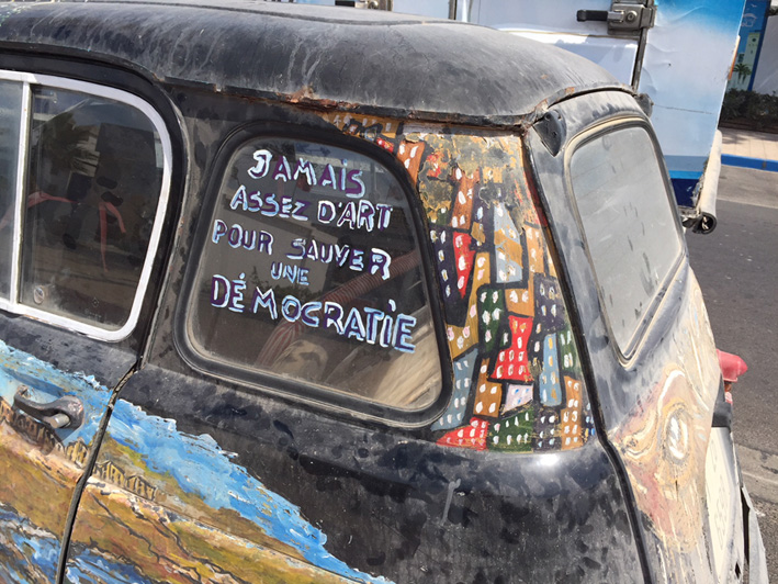 ... une brave Renault 4L qui a pris sa retraite à Essaouira aux mains d'un surfeur, sportif et philosophe en même temps ! Aussi peintre à ses heures, ce qui permet aux tôles de Billancourt (où elle a peut-être été montée par un O.S. marocain) de résister aux morsures du vent marin...