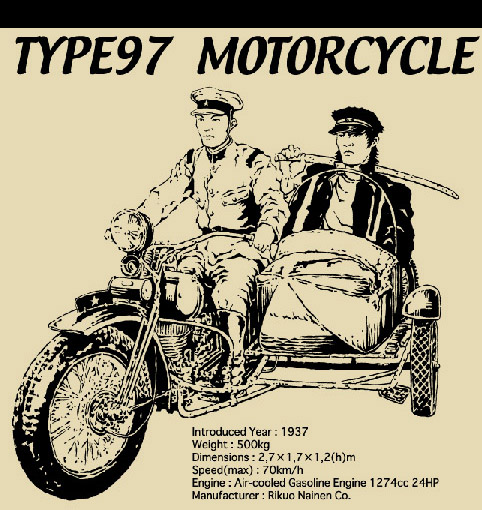 la licence de fabrication ou s'il s'agit d'une copie pure et simple sans autorisation... Avec ses 15 ch, le Motosacoche type "Jubilée" était un excellent choix, mais la carrière de cette Meguro Z 98 (*) cesse brutalement en 1941, au moment de l'attaque sur la flotte américaine de... Pearl Harbor le 7 décembre ! Entretemps, une dizaine d'exemplaires auront été livrés au très convoité marché représenté par la police municipale de Tokyo. Preuve que c'était une moto bien née, elle reprendra du service après la capitulation du Japon le 2 décembre 1945. (*) Pendant la guerre, les plus importants constructeurs de motos - dont Meguro - travaillèrent pour l'armée impériale, fournissant armement, munitions et un sidecar 1200 cm3 à roue tractée baptisé... Z 97. Le dessin ci-dessus le représente dans une version peu "militarisée", sans doute en illustration d'une notice de montage d'une maquette (de l'après-guerre). En opérations, la caisse du sidecar supportait un fusil-mitrailleur ou une mitrailleuse plus... meurtriers que le sabre de ce passager.