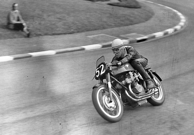 Pierre Monneret sera l'un des rares pilotes non-italiens (avec son père) à avoir couru sur la prestigieuse Gilera 4 cylindres. Il est ici au G.P. de Pau en 1953.