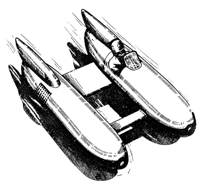 Dès 1948, son projet original est une machine à double fuselage, l'un destiné au pilote, l'autre à la motorisation (dessin ci-dessus). Hypothèse : peut-être faut-il en chercher l'idée du côté de la guerre précédente, lorsque la marine italienne fit tant de misères aux convois britanniques en Méditerranée. Les Italiens opéraient avec des sous-marins dits "de poche", mais qui étaient tout simplement des torpilles mues électriquement et chevauchées par deux hommes. Les Anglais apprirent la leçon et en utilisèrent eux aussi, par exemple contre le Tirpitz réfugié dans un fjord en Norvège. D'où cette publicité humoristique du grand Alex Oxley pour Triumph. L'image de gauche est celle d'une maquette italienne au 1/35 proposée par la Société Alteri