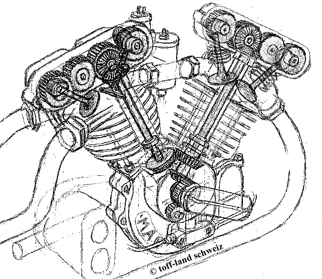 ... le tube avant du cadre se dédouble et se rejoint ensuite afin de faire place au boîtier trop proéminent de l'arbre à cames du cylindre avant. Peut-être afin d'avancer le moteur en diminuant l'empattement et rendre ainsi la machine plus agile sur circuit (?).