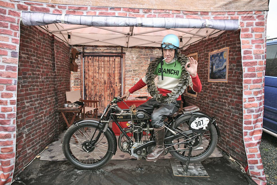Nuvolari a commencé sa carrière sur la Freccia Azzurra, une redoutable 500 monocylindre ACT de Bianchi. D'où les couleurs que Graeme portait au Vintage de Montlhéry, en alternance avec les anneaux entrelacés d'Auto-Union ainsi que la couronne de lauriers traditionnelle des circuits d'Outre-Rhin. Son stand en toile peinte, dans le style des "maisons"...