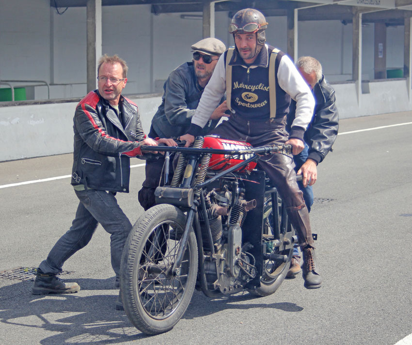 Tel le valet de pied d'un carrosse royal des siècles passés, l'impeccable pousseur du Brooklands Museum est aux ordres du pilote d'une Tri-JAP Speed 500 de 1936. La machine, destinée aux "runs" est tellement déshabillée que le seul endroit pour fixer son numéro du Vintage était le dos du pilote.