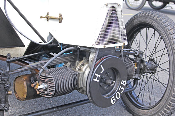 Autre costume immaculé, celui de Freddie (son nom est inscrit sur le dos de sa combinaison, voir photo plus haut), membre bénévole de l'organisation du Vintage. Il est venu spontanément prêter la main au départ de la N.L.G./Malanik. Le lanceur mécanique, prévu à cet usage, avait du mal à faire tousser le 2 litres 700 très peu démultiplié comme en témoignent les dimensions respectives des poulies de la transmission.