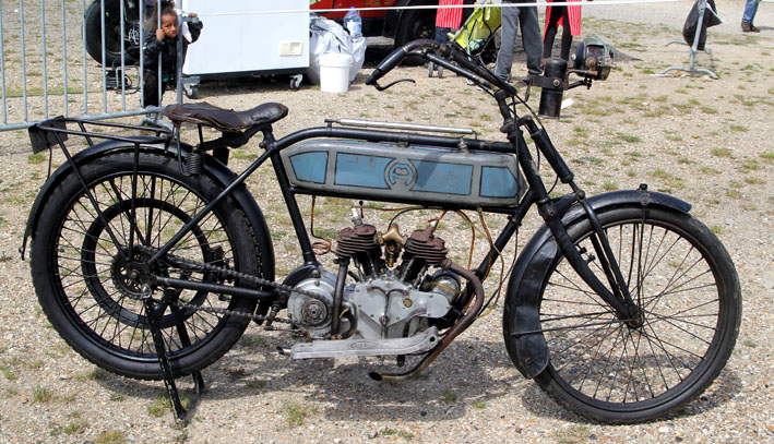On a vu plusieurs Alcyon anciennes, roulantes en piste ou dans le parc. Celle-ci est une 350 (52 mm x 82) bicylindre latérales plutôt moderne avec son bloc-moteur à 2 vitesses et embrayage par une paire de double cones, un par rapport. Sa transmission finale par chaîne est encore une rareté française pour 1914, date de sortie du premier modèle.